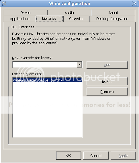 Ahora nos vamos a aplicaciones >> Wine >> Configurar Wine y elegimos la pestaña Librerías.- Añade winemp3.acm y aceptamos.